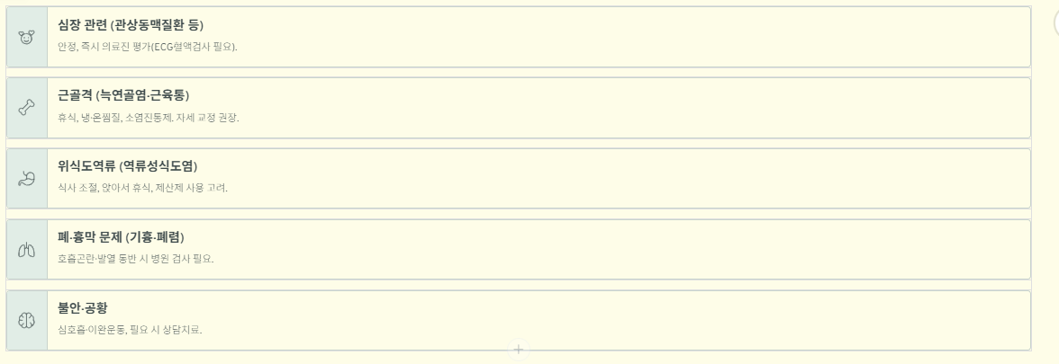- 동반증상: 호흡곤란, 식은땀, 어지럼, 구역감이 있는지 확인하세요.
