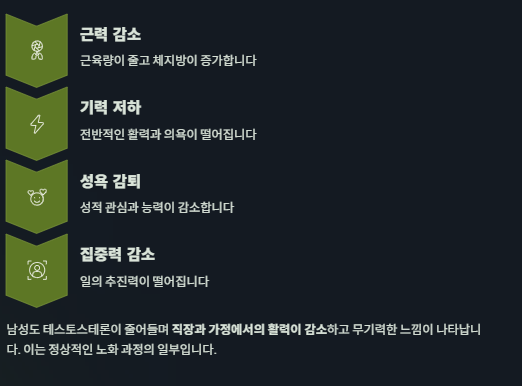 남성도 테스토스테론이 줄어들며 직장·가정에서의 활력이 감소하고 무기력한 느낌이 나타납니다.