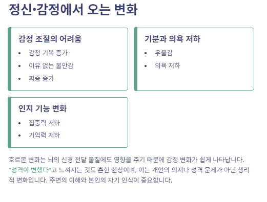 호르몬 변화는 뇌 신경 전달 물질에도 영향을 주기 때문에 감정 변화가 쉽게 나타납니다. “성격이 변했다”라고 느껴지는 것도 흔한 현상입니다.