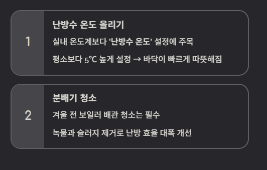 - 보일러 '난방수' 온도 올리기: 실내 온도계에만 의존하기보다, 보일러 설정에서 난방수 온도를 평소보다 5℃ 정도 높게 설정해 보세요. 바닥이 더 빠르게 따뜻해지면서 실내 전체 체감 온도가 올라갑니다.