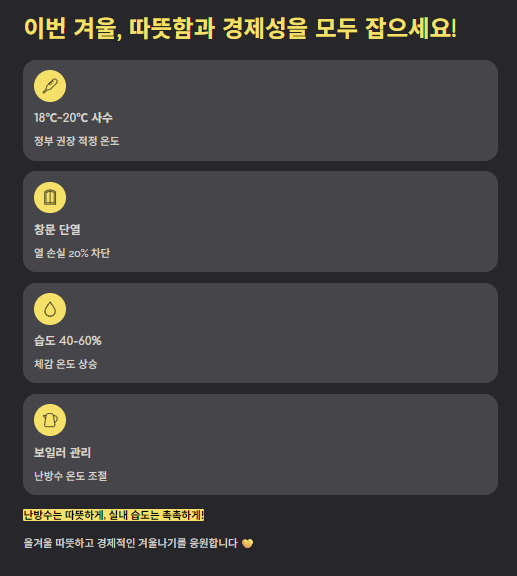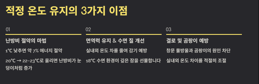 무조건 온도를 높이는 것은 난방비 폭탄의 지름길이며, 너무 낮추면 감기와 면역력 저하를 불러옵니다.