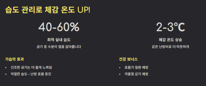 - 건강 관리: 적절한 습도는 난방 효율 증진뿐만 아니라 겨울철 호흡기 질환 및 감기 예방에도 큰 도움이 됩니다.