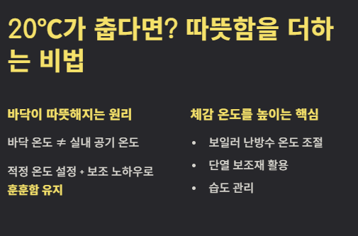 보일러 온도를 20℃에 맞춰 놓으면 춥다고 느끼는 분들이 많습니다. 이는 바닥 온도와 실내 공기의 온도가 다르기 때문입니다. 적정 온도를 설정하고도 훈훈함을 느끼게 해주는 실질적인 보조 노하우를 소개합니다.