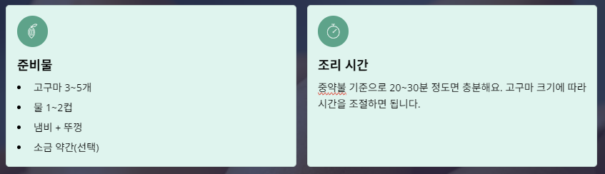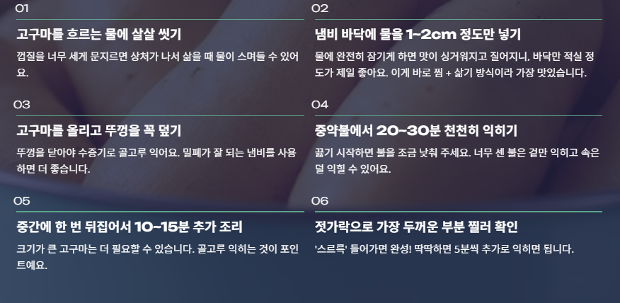 → 속까지 고르게 익음. - 호박고구마는 물 조금 + 짧게