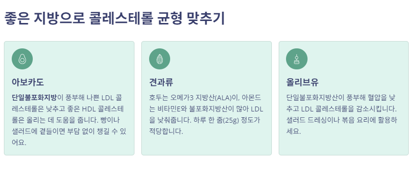 혈관 염증을 줄이고 LDL·중성지방을 자연스럽게 낮출 수 있어요.“약 먹기 전 단계”이거나 “약 복용 중에도 관리하고 싶은 분” 모두 식습관 개선은 필수입니다.