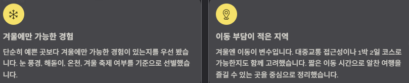 눈 풍경, 해돋이, 온천, 겨울 축제 여부를 기준으로 걸렀습니다.✅ 이동 부담이 적은 지역