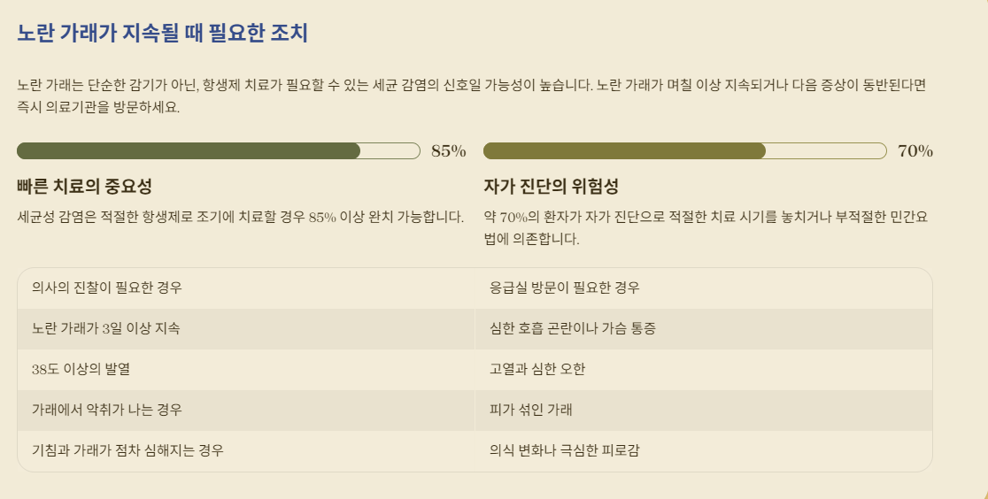 노란 가래는 단순한 감기가 아닌, 항생제 치료가 필요할 수 있는 세균 감염의 신호일 가능성이 높습니다. 만약 노란 가래가 며칠 이상 지속되거나, 다음과 같은 증상이 동반된다면 지체 없이 의료기관을 방문하여 정확한 진단과 치료를 받는 것이 중요합니다.