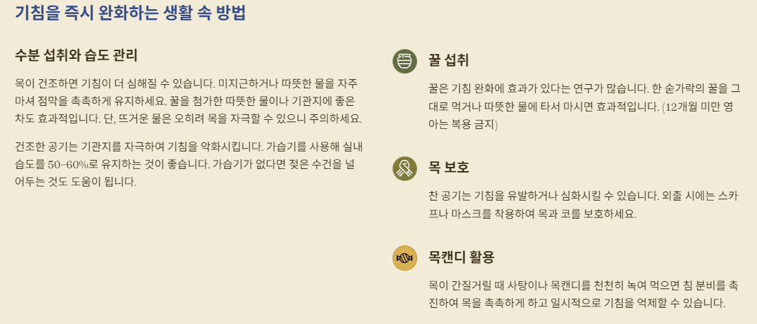 위의 방법들은 일시적인 증상 완화에 초점을 맞춘 것이며, 기침이 며칠 이상 지속되거나 특정 증상을 동반한다면 반드시 그 원인을 찾아 해결해야 합니다.