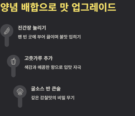 김치만으로 부족한 2%의 맛을 채워줄 양념 공식이 있어요. 제가 가장 추천하는 조합은 간장과 고춧가루, 그리고 약간의 굴소스예요. 특히 간장을 사용하는 방식이 중요한데, 재료와 바로 섞지 말고 팬의 빈 공간에 간장을 부어 살짝 눌리듯 끓여주는 거예요.