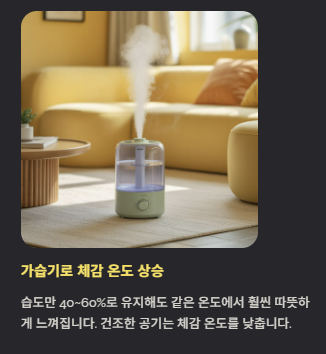 습도만 40~60%로 유지해도 같은 온도에서 훨씬 따뜻하게 느껴집니다.