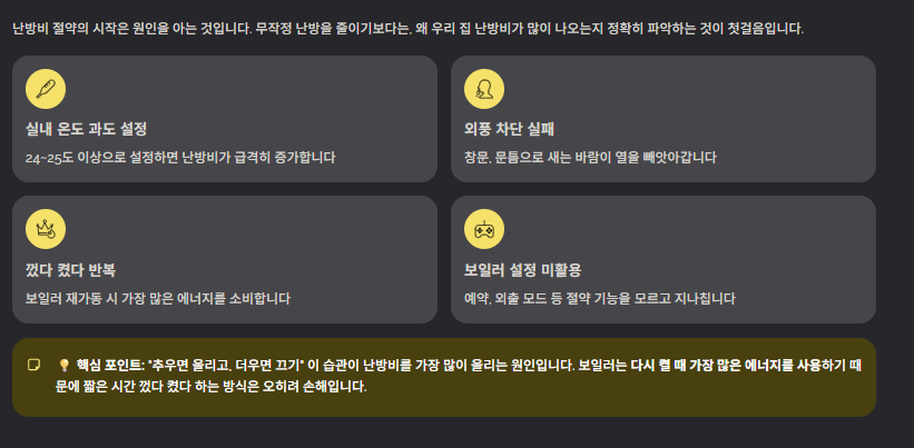 👉 난방은 집 전체가 아니라 ‘사람이 있는 공간’ 기준으로 하세요.