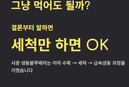 시중에 판매되는 냉동블루베리는 수확 → 세척 → 급속 냉동 과정을 거쳐 나오기 때문에 기본적인 위생은 이미 갖춰진 상태입니다. 바로 먹을 때 체크 포인트
