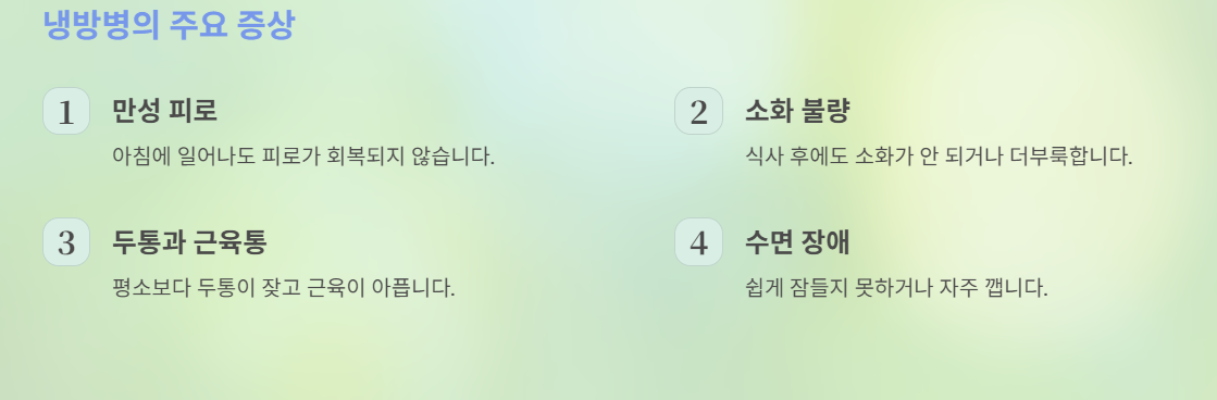 대표적인 증상으로는 만성 피로, 속 쓰림, 두통, 근육통, 그리고 수면 장애까지 이어질 수 있습니다. 특히 에어컨 바람을 하루 종일 맞고 있는 사무직 근무자들이라면 더 주의가 필요하죠. 체내 온도가 떨어지면서 혈액 순환이 둔해지고, 위장 기능도 저하되며 면역력이 급격히 떨어질 수 있습니다.