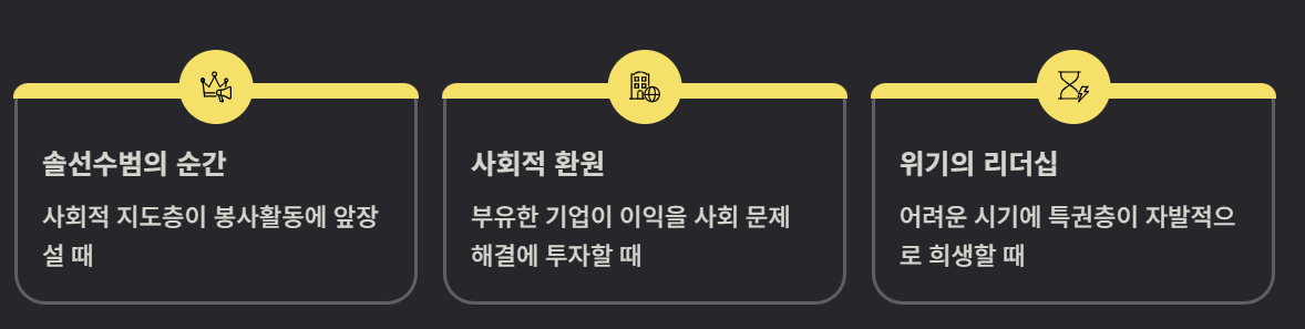- 현대에는 기부, 봉사, 솔선수범 등 사회적 책임을 다하는 리더십으로 해석됩니다.