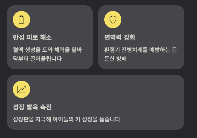 업무 스트레스로 늘 지쳐 있는 직장인이라면 녹용이 큰 도움이 될 수 있어요. 혈액 생성을 돕는 성분이 풍부해서 혈색을 좋게 하고 체력을 밑바닥부터 끌어올려 주거든요. 환절기마다 감기를 달고 사시는 분들이라면 면역 체계를 튼튼하게 세우는 목적으로 꾸준히 챙겨 드셔보시길 추천드려요.