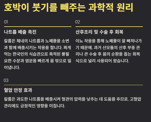 늙은 호박이 가장 유명해진 이유는 바로 강력한 부종(붓기) 해소 효과 덕분입니다. 이는 호박에 풍부하게 함유된 '칼륨(Potassium)' 성분 덕분입니다.