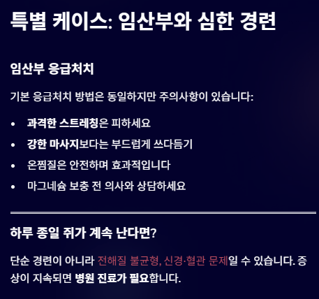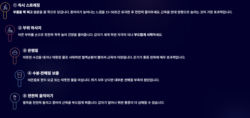수건을 데워 대거나, 따뜻한 물을 종아리에 흘려주는 것도 매우 효과적입니다.④ 수분 + 전해질 보충