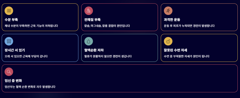 근육 피로 + 전해질 부족이 가장 흔한 원인이다.