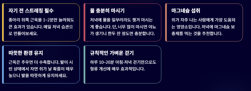 수분·전해질 보충이 핵심이다. 수면 중 쥐가 자주 난다면 생활 습관과 영양 상태를 점검해야 합니다.
