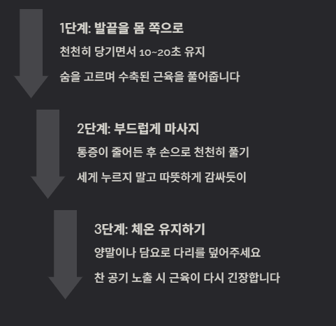 아래 방법은 실제로 가장 많이 사용되는 기본 응급 처치입니다.✅ 발끝을 몸 쪽으로 천천히 당기기