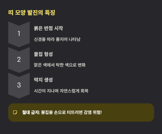물집은 처음엔 맑은 색이었다가 시간이 지나면서 탁해지고, 나중에는 딱지로 변하게 됩니다. 이 과정에서 가려움증보다 훨씬 강한 통증이 동반되는데, 어떤 분들은 옷자락만 스쳐도 소리를 지를 만큼 아프다고 표현하시기도 해요.