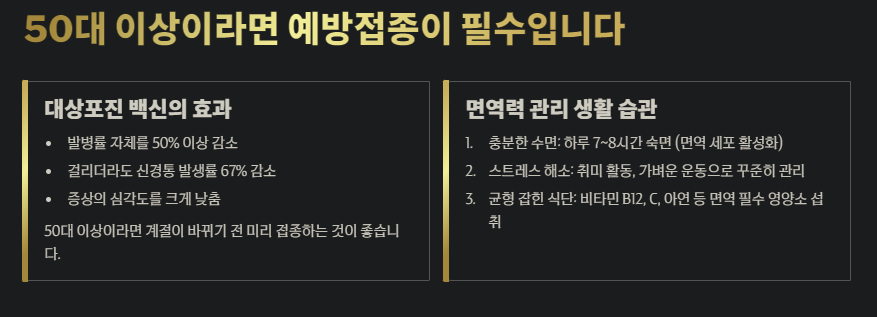 대상포진의 가장 큰 원인이 면역력 저하인 만큼, 예방접종과 일상적인 면역 관리가 필수입니다.