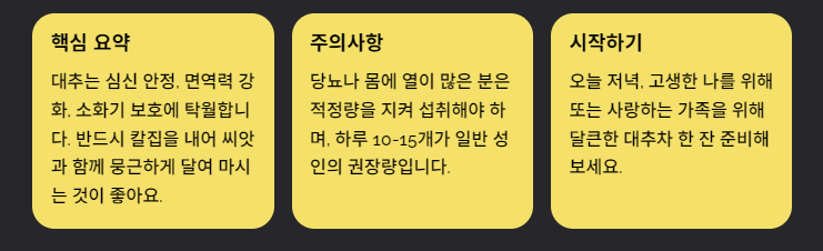 오늘 저녁에는 고생한 나를 위해, 혹은 사랑하는 가족을 위해 달큰한 대추차 한 잔 준비해 보시는 건 어떨까요? 여러분의 편안한 밤과 건강한 내일을 진심으로 응원해요!