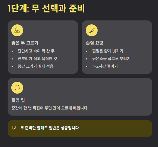 무 준비 단계가 전체 맛을 좌우합니다. 이 단계만 잘 지켜도 동치맛있게 담그는 방법의 절반은 완성입니다.