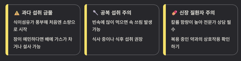 혈당 조절에 좋다고 알려져 있지만, 너무 빈속에 많이 먹으면 일시적으로 속이 쓰릴 수 있어요. 가급적 식사 중이나 식후에 챙겨 드시는 것을 권장하며, 만약 신장이 약하신 분이라면 칼륨 함량이 높으니 전문가와 상의 후 드시는 것이 안전합니다.
