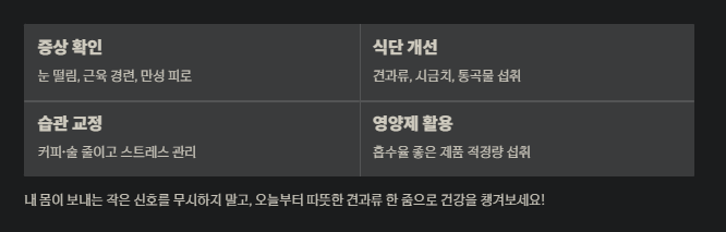 가장 대표적인 신호는 역시 눈 주변 근육이 내 의지와 상관없이 떨리는 거예요. 또한 자다가 갑자기 다리에 쥐가 나거나 근육이 딱딱하게 뭉치는 느낌이 든다면 마그네슘이 모자라다는 강력한 신호일 수 있으니 주의 깊게 살펴보세요.