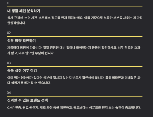 영양제만으로 모든 게 해결되진 않습니다. 기본이 잡혀야 체감 효과도 빨라집니다.