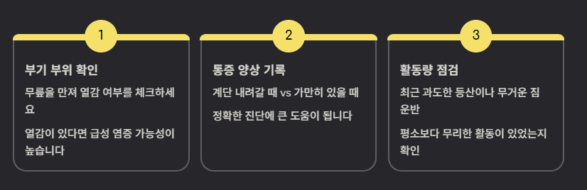 - 통증 양상 기록하기: 계단을 내려갈 때 아픈지, 가만히 있어도 쑤시는지 기록해 두면 진료 시 정확한 진단에 도움이 됩니다.