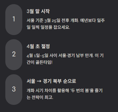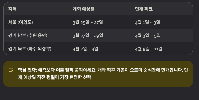 ✅ 예상 개화 및 만개 시기 (서울·경기 기준)
