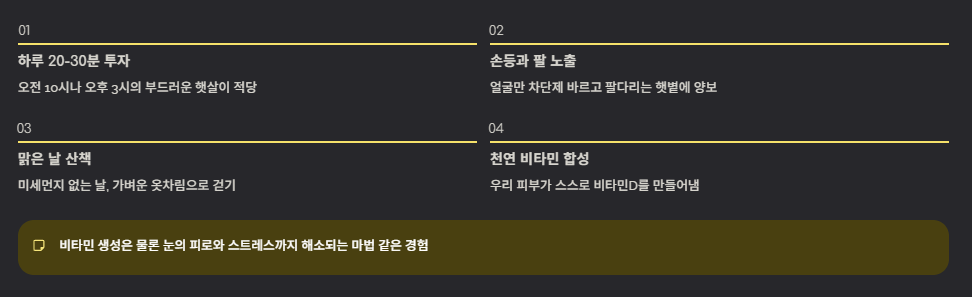 하루에 딱 20~30분 정도만 투자해 보세요. 너무 뜨거운 한낮보다는 오전 10시나 오후 3시쯤의 부드러운 햇살이 적당합니다. 이 시간에 걷다 보면 비타민 생성은 물론이고, 눈의 피로도 풀리고 스트레스까지 해소되는 마법 같은 경험을 하게 될 거예요.