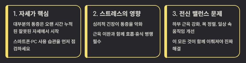 근육 이완과 함께 ‘호흡·휴식’이 반드시 병행되어야 한다.결론 3. 통증은 승모근만의 문제가 아니라 ‘전신 밸런스 문제’
