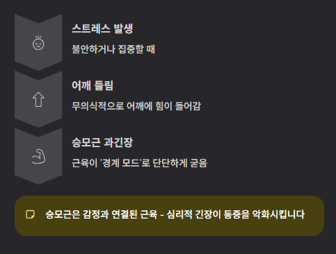그 순간 이미 승모근은 계속 힘이 들어가 있는 상태입니다.✔ 신체 반응으로 나타나는 승모근 통증