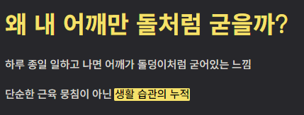 "하루를 마치고 어깨를 만져보면 돌덩이처럼 굳어 있는 느낌, 누구나 한 번쯤 경험하셨을 거예요.