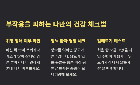 - 알레르기 테스트: 아주 드물게 양파 알레르기가 있는 분들이 있습니다. 처음 한 모금 마셨을 때 입 주변이 가렵거나 두드러기가 나지 않는지 잘 살펴야 합니다.