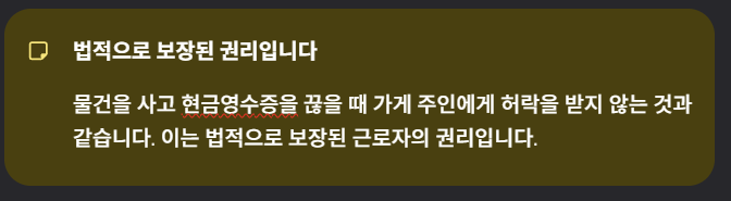 - 비유: 물건을 사고 현금영수증을 끊을 때 **'가게 주인에게 허락'**을 받지 않는 것과 같습니다. 이는 법적으로 보장된 근로자의 권리입니다.