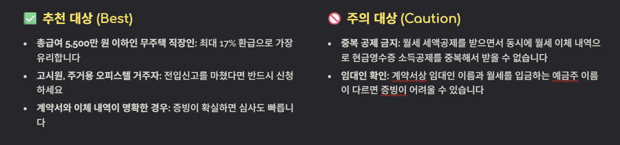 구분 월세 세액공제 월세 소득공제 (현금영수증) 환급 방식 결정세액에서 직접 차감 (강력함) 전체 소득 금액에서 차감 급여 조건 총급여 7,000만 원 이하만 가능 급여 제한 없음 환급률 월세액의 15% ~ 17% 신용카드 등 사용액 합산 15% 핵심 요건 무주택 세대주 + 전입신고 필수 전입신고 불필요 (홈택스 신청) 4. 이런 분은 꼭 신청하시고, 이런 실수는 주의하세요