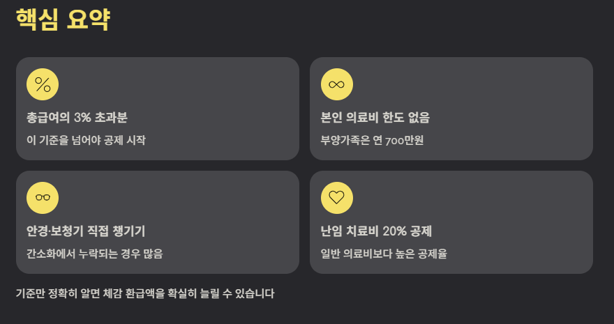 이 기본 구조를 먼저 이해해야 연말 의료비 공제 계산이 쉬워집니다.