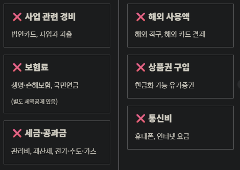 아래 항목들은 소득세법상 다른 방식으로 공제를 받거나, 세금 회피 목적으로 간주되어 연말정산 카드 공제 대상에서 제외됩니다.