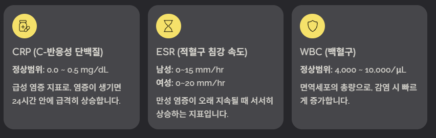 염증 수치는 우리가 모르게 진행되는 몸속 염증 상태를 가장 빠르게 보여주는 지표입니다. 병원에서 흔히 확인하는 대표 항목은 CRP, ESR, WBC 세 가지입니다. 각각의 의미와 정상범위, 그리고 집에서 스스로 체크할 수 있는 방법을 알아보겠습니다.