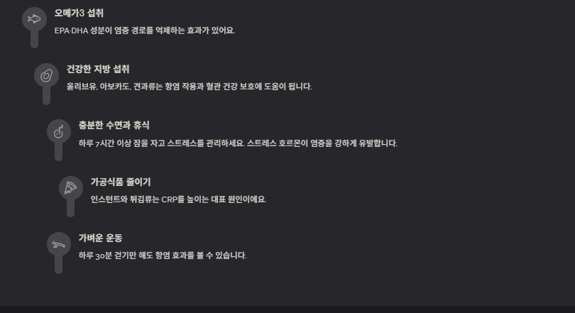 항목 해당여부 이유 없는 피로가 1주 이상 지속된다 ✔/✖ 잇몸 염증, 구내염이 자주 반복된다 ✔/✖ 복통·설사·변비 등 장 트러블이 잦다 ✔/✖ 아침 관절 뻣뻣함 또는 근육통이 있다 ✔/✖ 피부 트러블 또는 붉은기·가려움이 잦다 ✔/✖ 미열 또는 열감이 자주 느껴진다 ✔/✖ 감기에 자주 걸리고 회복이 느리다 ✔/✖ 4. 염증 수치 낮추는 데 도움 되는 생활 습관