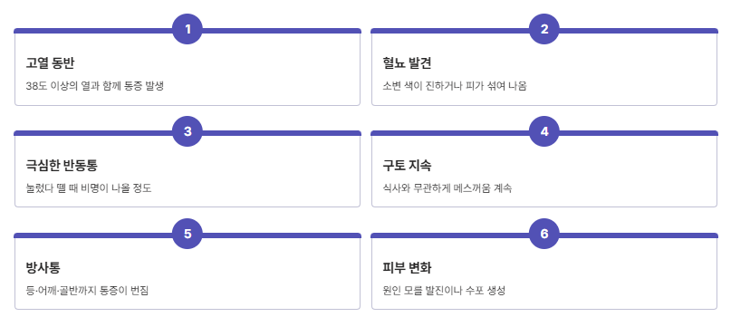 - 소변 상태 관찰: 혈뇨가 비치거나 소변 시 통증이 느껴진다면 이는 단순 근육통이 아니라는 명확한 증거입니다.