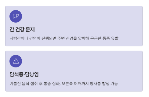또 하나 주의 깊게 보셔야 할 것이 바로 담석증이나 담낭염이에요. 만약 식사 후, 특히 기름진 음식을 먹은 뒤에 통증이 심해진다면 담낭의 문제일 확률이 높습니다. 통증이 옆구리를 넘어 오른쪽 어깨까지 뻗치는 '방사통'이 나타나기도 하는데, 이는 담낭이 보내는 아주 강력한 SOS 신호라고 이해하시면 됩니다.