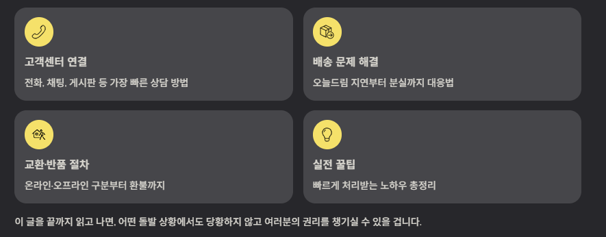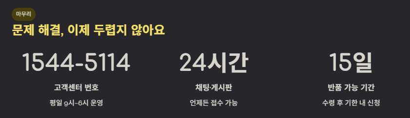 항목 상세 내용 이용 꿀팁 전화 상담 1544-5114 (평일 09:00~18:00) 오전 10시~11시 사이가 비교적 한산함 1:1 게시판 앱/홈페이지 내 문의 접수 (24시간) 파손 시 송장+제품 사진 첨부 필수 채팅 상담 챗봇 리아 및 실시간 상담원 연결 카카오톡 플러스 친구로도 이용 가능 오늘드림 배송 지연 및 주소지 오류 문의 배송 시작 전 신속하게 고객센터 연락 반품/교환 수령 후 15일 이내 접수 가능 온라인 구매는 온라인으로, 오프라인은 매장으로