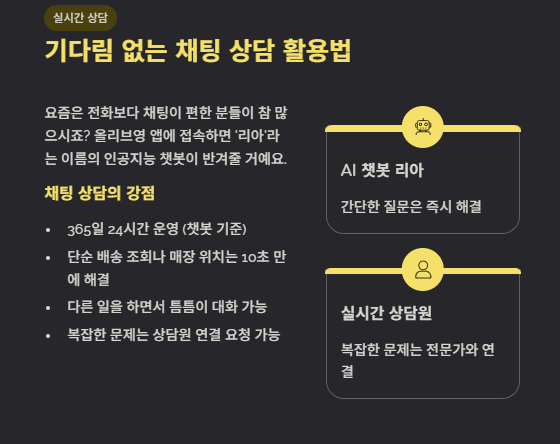 요즘은 전화보다 채팅이 편한 분들이 참 많으시죠? 올리브영 앱에 접속하면 '리아'라는 이름의 인공지능 챗봇이 반겨줄 거예요. 챗봇 상담은 365일 24시간 내내 열려 있어서, 단순한 배송 조회나 매장 위치 확인 같은 것들은 10초 만에 해결해 주기도 하죠.