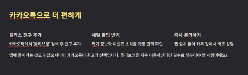 앱에 들어가는 것도 귀찮으시다면 카카오톡에서 '올리브영'을 검색해 친구 추가를 해보세요. 카톡 창에서도 바로 상담 메뉴를 이용할 수 있거든요. 세일 정보도 받고 궁금한 점도 바로 물어볼 수 있으니, 올리브영을 자주 이용하신다면 필수로 해두어야 할 세팅이라고 할 수 있습니다.