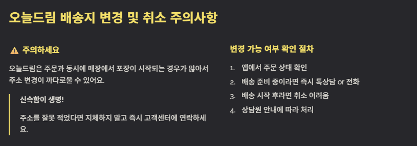 오늘드림은 주문과 동시에 매장에서 포장이 시작되는 경우가 많아서 주소 변경이 까다로울 수 있어요. 만약 주소를 잘못 적었다면 지체하지 말고 즉시 올리브영 고객센터 톡상담이나 전화를 통해 변경 가능 여부를 확인해야 합니다. 이미 배송이 시작되었다면 취소가 어려울 수 있으니 신속함이 생명이에요!
